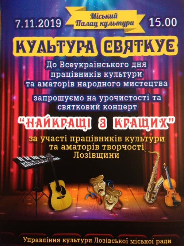 9 ноября-Всеукраинский день работников культуры и любителей народного искусства. По случаю праздника Управление культуры городского совета приглашает всех жителей Лозовской ОТГ, всех неравнодушных к культуре и искусству 7 ноября в 15-00 ч. на праздничную концертную программу в городской Дворец культуры.