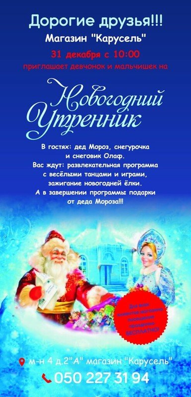Магазин "Карусель" 31 декабря с 10:00 приглашает девчонок и мальчишек на Новогодний утренник.
