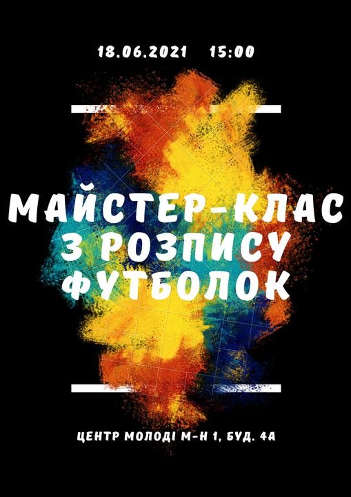 Приходь до нас на майстер-клас з розпису футболок батиком, захопи з собою річ, яку будеш декорувати (вона повинна бути з шифону, атласу, або шовку, краще білого кольору), та гарний настрій. Майстерклас відбудеться у 2 етапи: