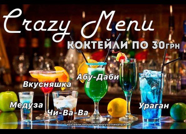 Щоп'ятниці та щосуботи, до 00:00 коктейлі по 30 грн з «Krazy menu»