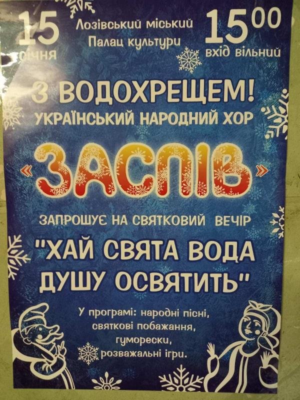 15 січня о 15 годині міський Палац культури запрошує любителів української пісні на святковий вечір народного хору "ЗАСПІВ". Вхід вільний.