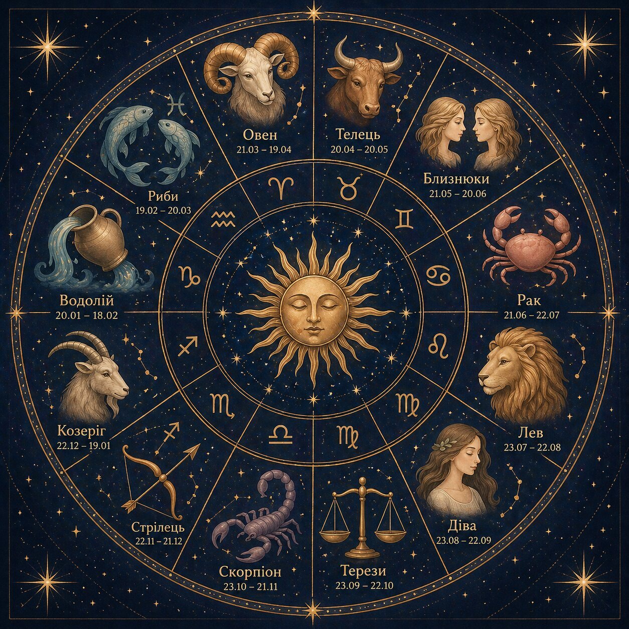 Зодіак – це пояс із дванадцяти сузір'їв, через які Сонце проходить упродовж року. Знак, у якому перебувало Сонце в момент народження людини, і називається її знаком Зодіаку.