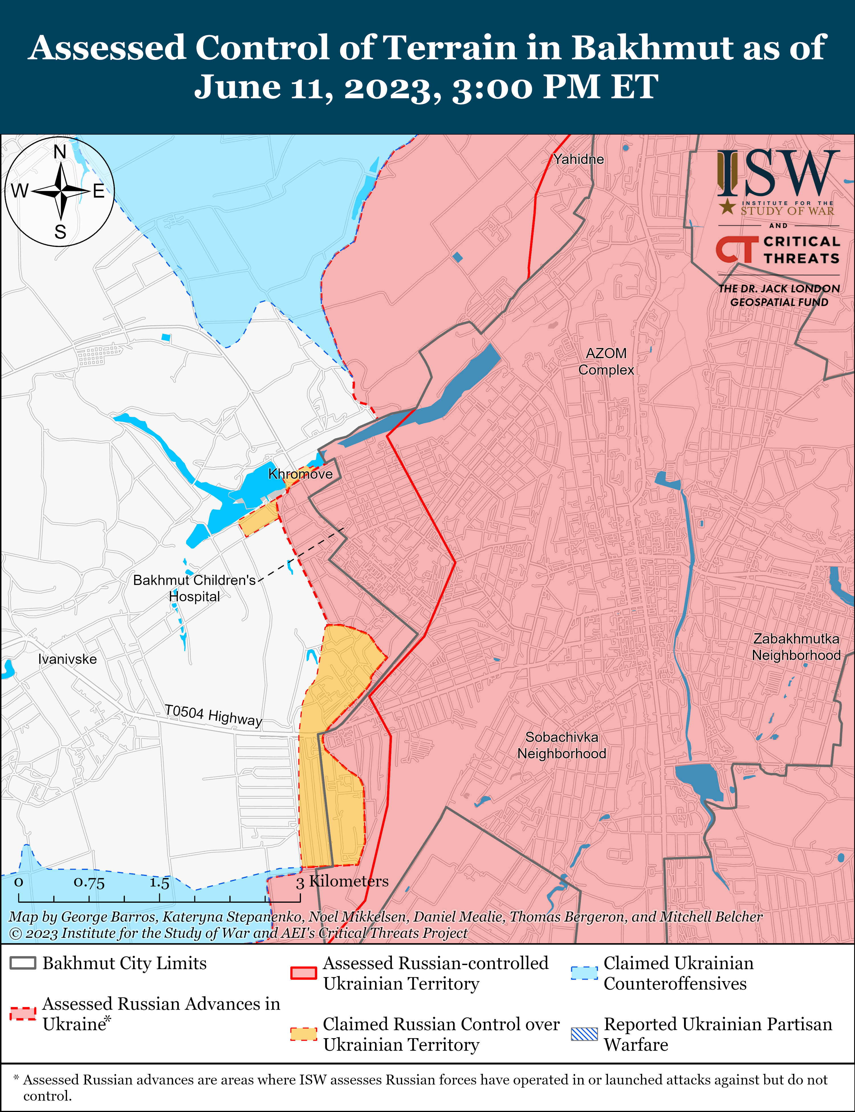 Українські та російські сили продовжували обмежені наземні атаки навколо Бахмута 11 червня. Російські військові блогери стверджували, що українські сили атакували поблизу Кліщіївки (7 км на південний захід від Бахмута), і що підрозділи російського спецназу намагаються відкинути українські сили з позицій поблизу Кліщіївки.